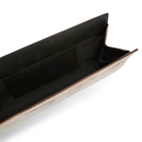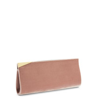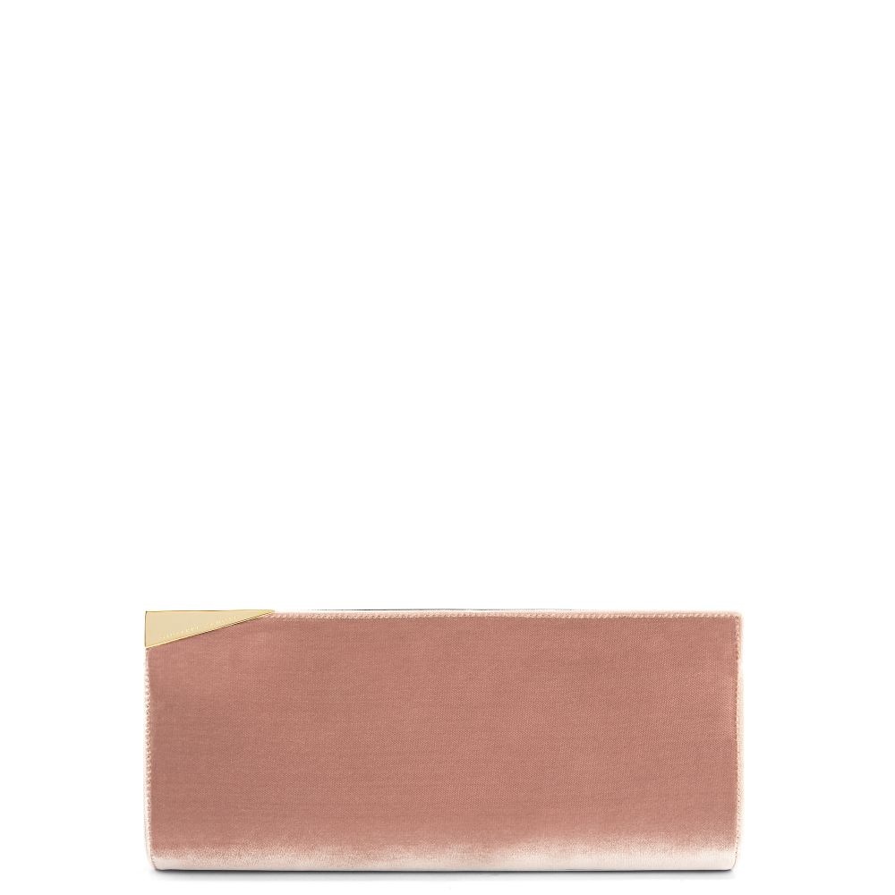 Product Details This clutch is crafted from velvet-effect powder-pink synthetic fabric and features a triangular golden metal detail on the top end, a magnetic fastening and a fabric inner lining with card slots. Velvet-effect powder pink synthetic fabric Triangular golden metal detail Magnetic fastening Black fabric inner lining with card slots Measurements: 300 mm x 135 mm x 55 mm Made in Italy