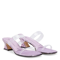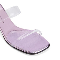Product Details Pink mules with matching leather sole, featuring clear PVC straps and matching chromed spool heels. Clear PVC Pink chromed heel 45 mm heel Leather sole with logo Made in Italy