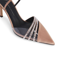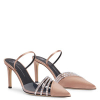 Product Details These pointed-toe pink satin mules, featuring a toe box with a clear PVC insert and a thin strap on the instep, are embellished with embroidered rows of crystal-coloured rhinestones and a matching covered heel. Pink satin and clear PVC Crystal-coloured rhinestone embroidery Heel covered in pink satin 85 mm heel Leather sole with logo Made in Italy