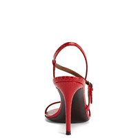 Product Details Reptile-print leather sandals with thin straps, metal buckles and stiletto heel. - Red reptile-print leather - Light golden metal buckle - 90 mm-high heel. - Brown leather sole with logo ORIGIN: ITALY COLOR: RED
