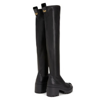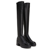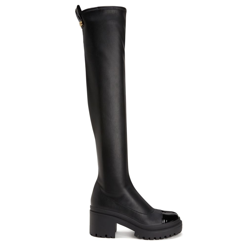 Product Details Knee-length boots in leather-effect stretch fabric with patent leather toe, chunky heel and rubber one-piece sole. - Black synthetic fabric with leather effect upper and black patent toecap - Golden metal 'Logozali' detail - 70 mm heel - One-piece black rubber sole with logo ORIGIN: ITALY COLOR: BLACK