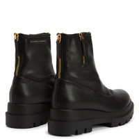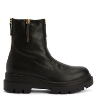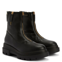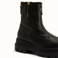 Product Details Combat boots in leather-effect fabric with zip and rubber one-piece sole. - Black leather-effect synthetic fabric - Golden metal zip - 40mm heel - One-piece rubber sole with logo ORIGIN: ITALY COLOR: BLACK