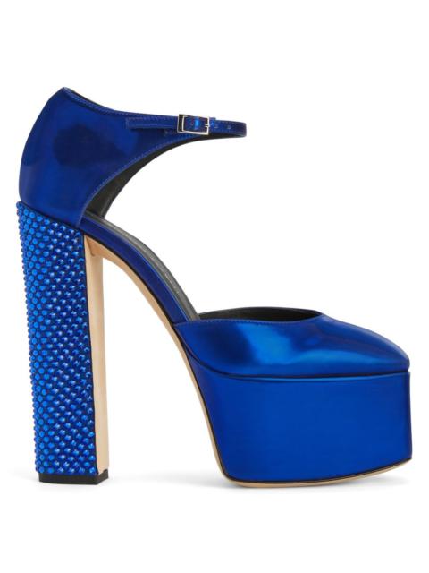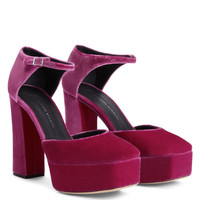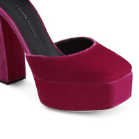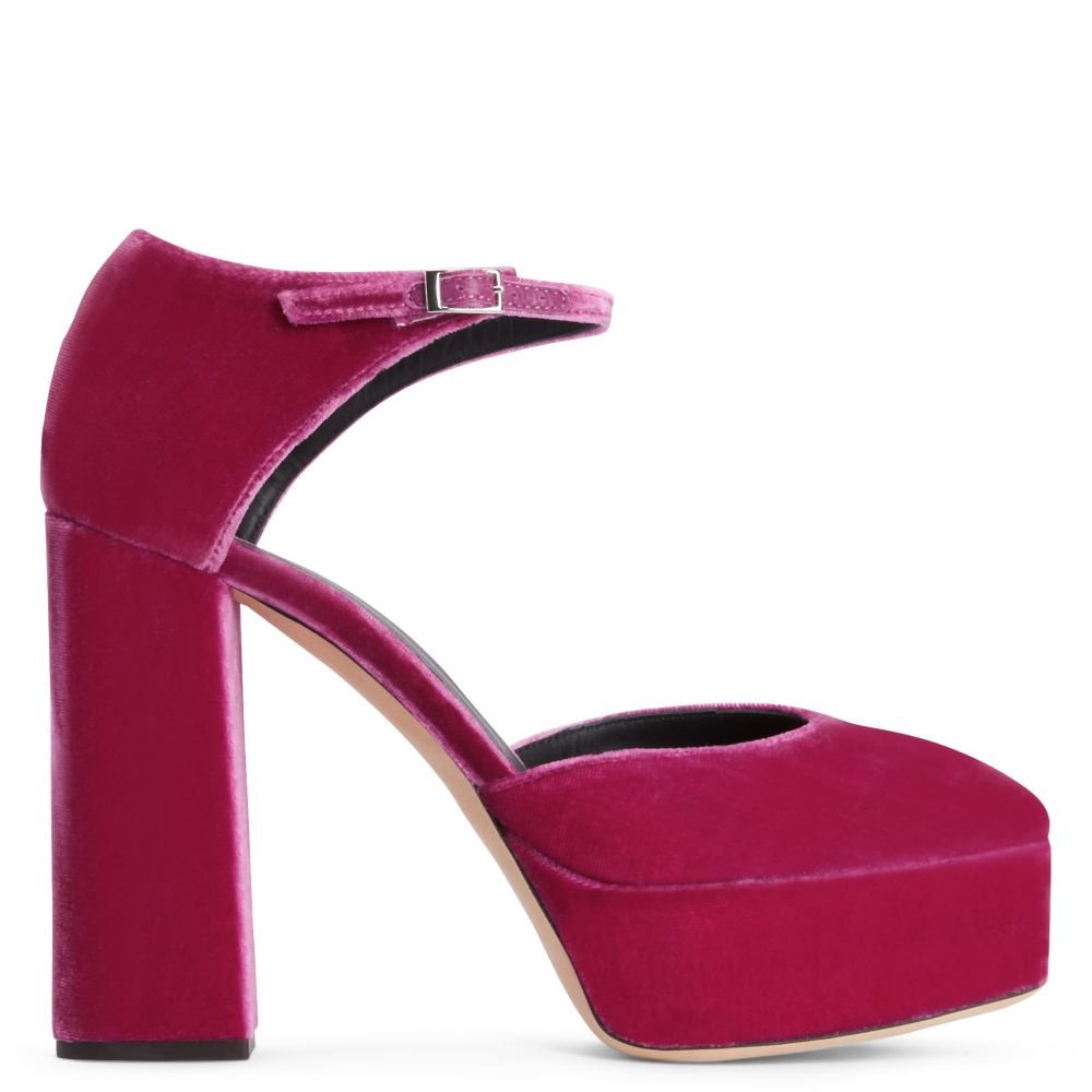 Product Details These sandals, crafted from fuchsia velvet, feature a matching closed heel, an adjustable ankle strap with a silver metal buckle and matching covered chunky heels and platform. Fuchsia velvet Adjustable strap with silver metal buckle 40 mm platform covered in fuchsia velvet 120 mm heel covered in fuchsia velvet Leather sole with logo Made in Italy
