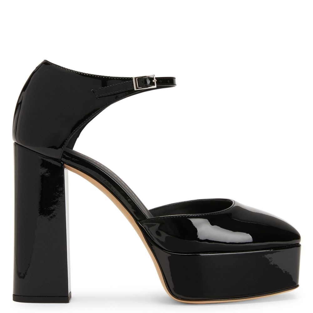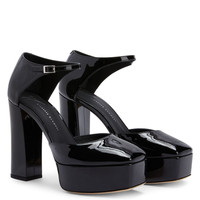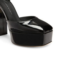 Product Details These sandals, crafted from black patent-effect synthetic fabric, feature a matching closed heel, an adjustable ankle strap with a silver metal buckle and matching covered chunky heels and platform. Black patent-effect fabric (34% PL; 66% PU) Adjustable strap with silver metal buckle 40 mm platform covered in black patent-effect synthetic fabric (34% PL; 66% PU) 120 mm heel covered in black patent-effect synthetic fabric (34% PL; 66% PU) Leather sole with logo Made in Italy