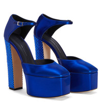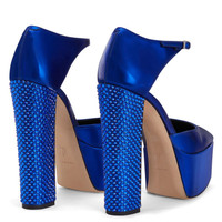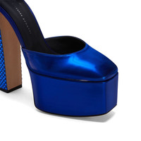 Product Details These sandals, crafted from cornflower-blue laminated synthetic fabric, feature matching closed heels, an adjustable ankle strap with a silver metal buckle, a chunky heels with a cornflower-blue rhinestone embroidery and a matching platform. Cornflower-blue laminated synthetic fabric (80% PU; 13% PL; 7% CO) Heel with cornflower-blue rhinestones embroidery Adjustable strap with silver metal buckle 150 mm heel 70 mm platform Leather sole with logo Made in Italy