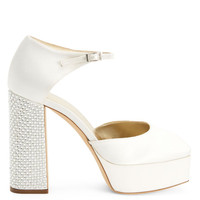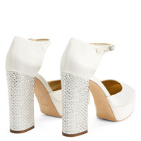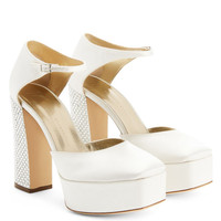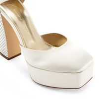 Product Details White satin sandals with covered heel and ankle strap with adjustable silver metal buckle, distinguished by a chunky high heel with silver rhinestone embroidery and a matching covered platform. White satin upper Crystal-coloured rhinestone embroidery 120mm heel Platform height 40 mm Matching covered heel Leather sole with logo Made in Italy