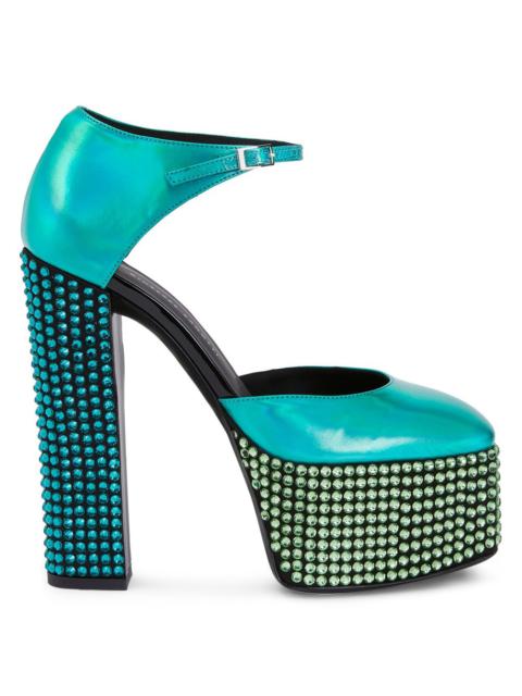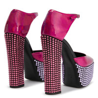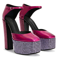 Product Details Sandals crafted from fuchsia laminated leather, featuring a closed heel and an adjustable buckle ankle strap, and characterised by rows of fuchsia and lilac rhinestones embroidered on both the platform and the chunky heel, infusing this model with an unapologetic disco glamour appeal. Fuchsia laminated leather Lilac and fuchsia rhinestones embroidery on heel and platform Adjustable strap with silver metal buckle 150 mm heel 70 mm platform Leather sole with logo Made in Italy