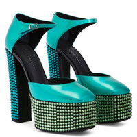 Product Details Sandals crafted from light-blue laminated leather, featuring a closed heel and an adjustable buckle ankle strap, and characterised by rows of peridot and emerald green rhinestones embroidered on both the platform and the chunky heel, infusing this model with an unapologetic disco glamour appeal. Light-blue laminated leather Peridot green and emerald green rhinestones embroidery on heel and platform Adjustable strap with silver metal buckle 150 mm heel 70 mm platform Leather sole with logo Made in Italy