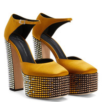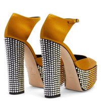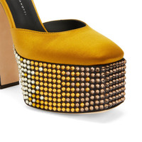Product Details Made from yellow satin, these sandals feature a closed heel and an adjustable buckle ankle strap and are embellished by rows of yellow rhinestones embroidered on both the platform and the chunky heel, infusing this model with an unapologetic disco glamour appeal. Yellow satin Yellow rhinestone embroidery on heel and platform Adjustable strap with silver metal buckle 150 mm heel 70 mm platform Leather sole with logo Made in Italy