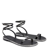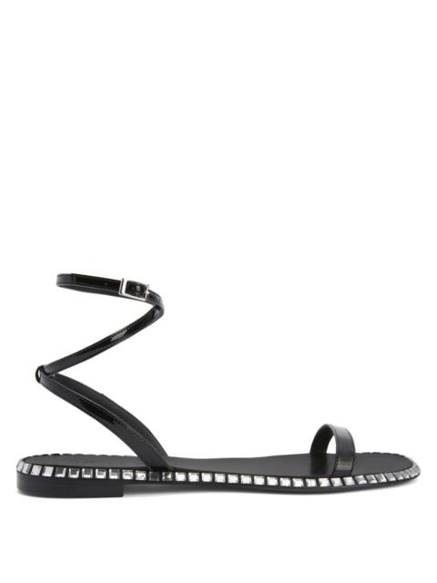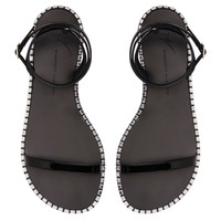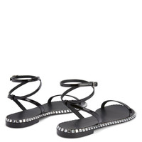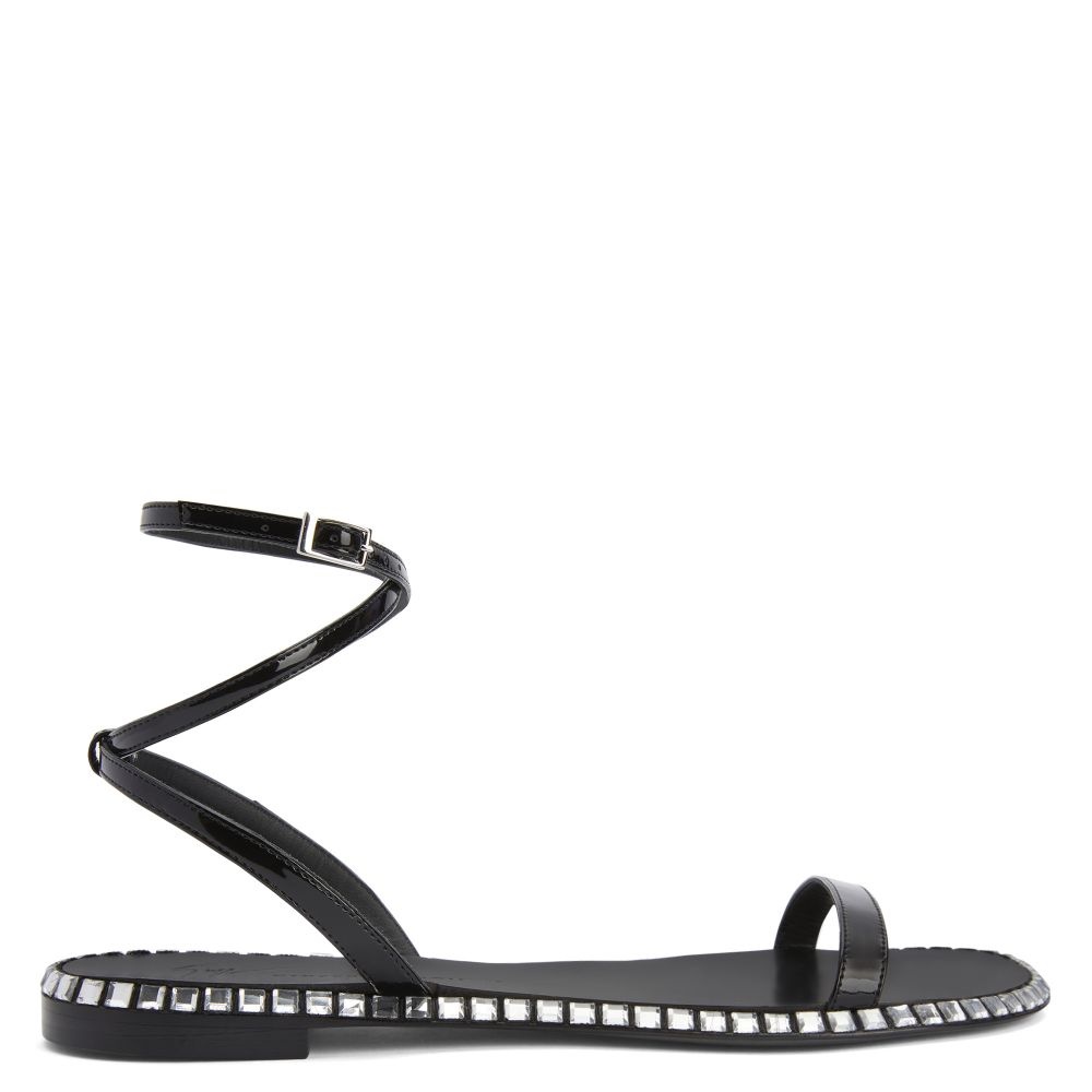 Product Details Flat sandals in black patent-effect synthetic fabric, with leather sole embellished with crystal-coloured rhinestones around the edge and criss-crossing ankle strap adjustable via the small metal buckle. Black patent-effect synthetic fabric: 34%PL 66%PU 10 mm heel Logo-bearing leather sole embellished with crystal-coloured rhinestones Made in Italy
