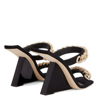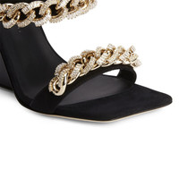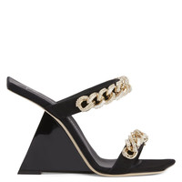 Product Details This black suede mule sandal has bands embellished with a golden metal chain accessory with crystal-coloured rhinestones. Complete with leather sole, this shoe is characterised by its squared edges and peculiar silhouette that gives it an alluring futuristic style. Black suede Metal chain accessory with rhinestones Wedge height 105 mm Leather sole with logo Made in Italy