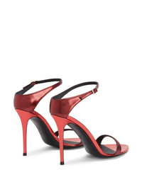 Product Details Mules crafted from laminated leather-effect burgundy synthetic fabric with a leather sole, featuring an adjustable ankle strap with silver metal buckle and matching covered stiletto heels. Laminated leather-effect burgundy synthetic fabric Silver metal buckle detail 105 mm heel covered in red mirrored leather Leather sole with logo Made in Italy