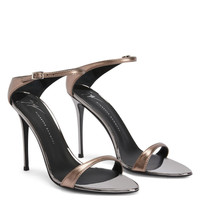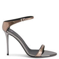 Product Details Mules crafted from laminated leather-effect gunmetal synthetic fabric with a leather sole, featuring an adjustable ankle strap with silver metal buckle and matching covered stiletto heels. Laminated leather-effect gunmetal synthetic fabric Silver metal buckle detail 105 mm heel covered in gunmetal mirrored-effect synthetic fabric Leather sole with logo Made in Italy