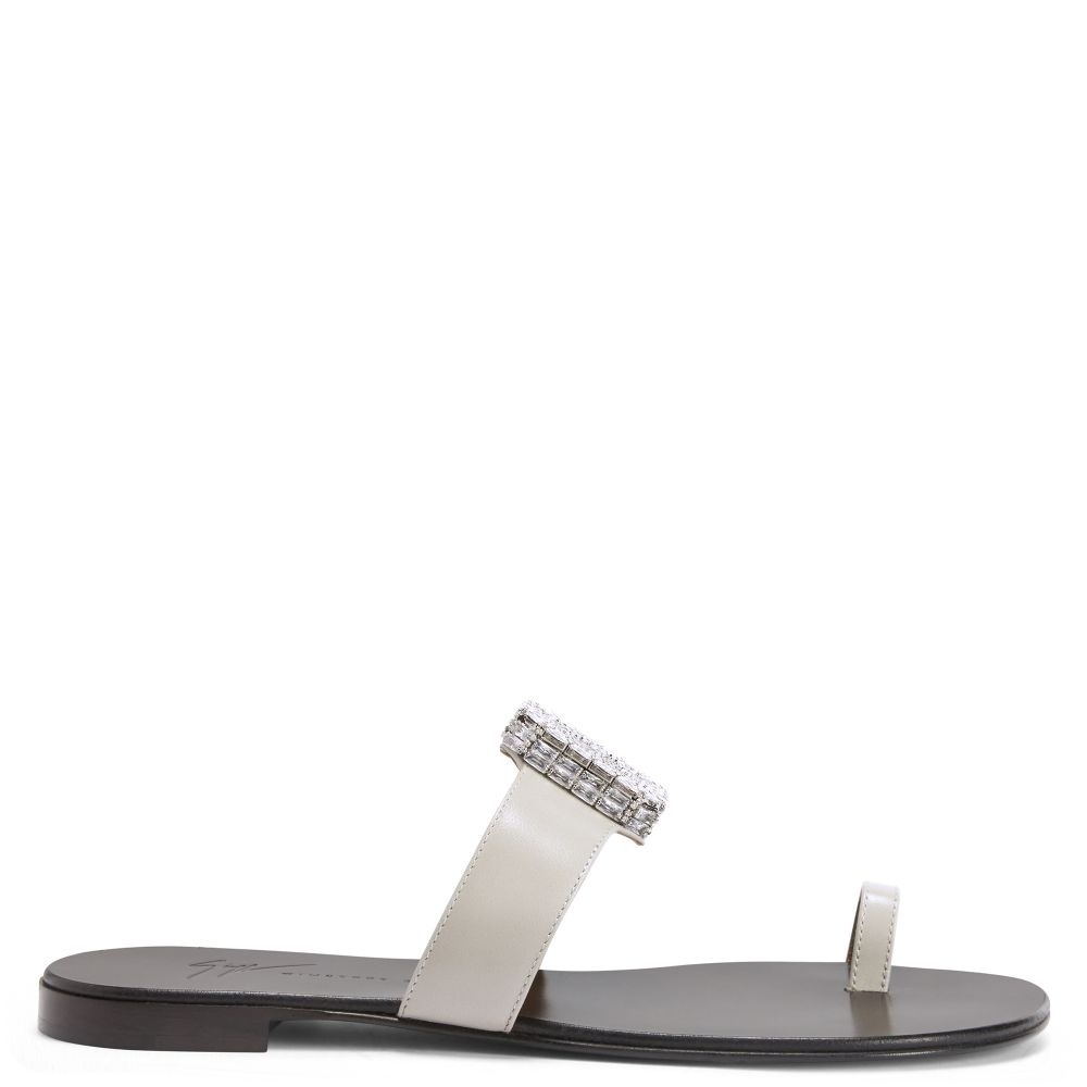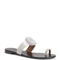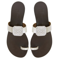 Product Details Flat thong sandals in leather with crystal-rhinestoned maxi brooch and leather sole. - Pale grey leather - Silver-coloured metal embellishment with crystal-coloured rhinestones - 10mm-high heel - Glossy brown leather sole with logo ORIGIN: ITALY COLOR: GREY