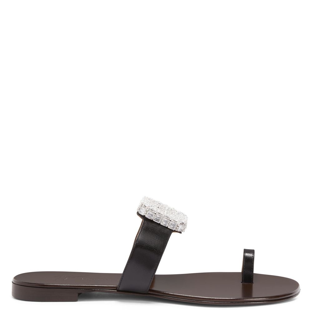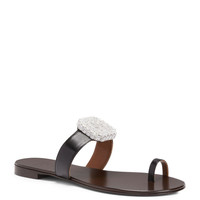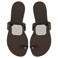 Product Details Flat thong sandals in leather with crystal-rhinestoned maxi brooch and leather sole. - Black leather - Silver-coloured metal embellishment with crystal-coloured rhinestones - 10mm-high heel - Glossy brown leather sole with logo ORIGIN: ITALY COLOR: BLACK