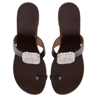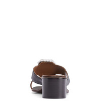 Product Details Mule thong sandals in leather with crystal-rhinestoned maxi brooch and chunky heel. - Black leather - Silver-coloured metal embellishment with crystal-coloured rhinestones - 40 mm-high heel - Glossy brown leather sole with logo ORIGIN: ITALY COLOR: BLACK