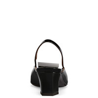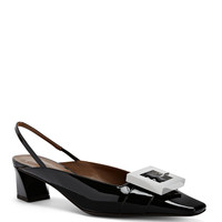 Product Details Patent leather slingback pumps with square topline and toe, metal maxi buckle, rear strap with elastic insert and block heel. - Black patent leather - Silver-coloured metal maxi buckle - 45 mm-high heel. - Black patent-covered heel - Brown leather sole with logo ORIGIN: ITALY COLOR: BLACK