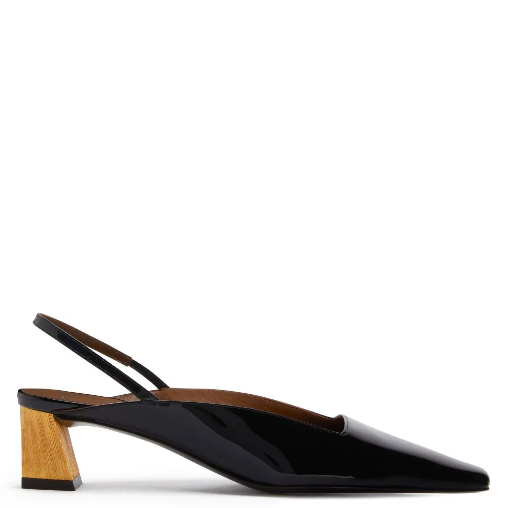 Product Details Slingback pumps in patent leather with square topline and toe, rear strap with elastic insert and knurled metal-effect chunky heel. - Black patent leather - 45 mm-high heel with gold-colored knurled metal effect. - Brown leather sole with logo ORIGIN: ITALY COLOR: BLACK