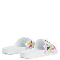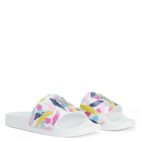 Product Details These slide sandals feature a white rubber sole and a white leather-effect synthetic fabric strap printed with multicolour glitter brushstrokes and embellished with a maxi silver metal 'Signature' detail. White synthetic fabric with leather effect and printed with multicoloured glitter brushstrokes (58% PU; 42% PA) Silver metal 'Signature' detail White rubber sole with logo Made in Italy