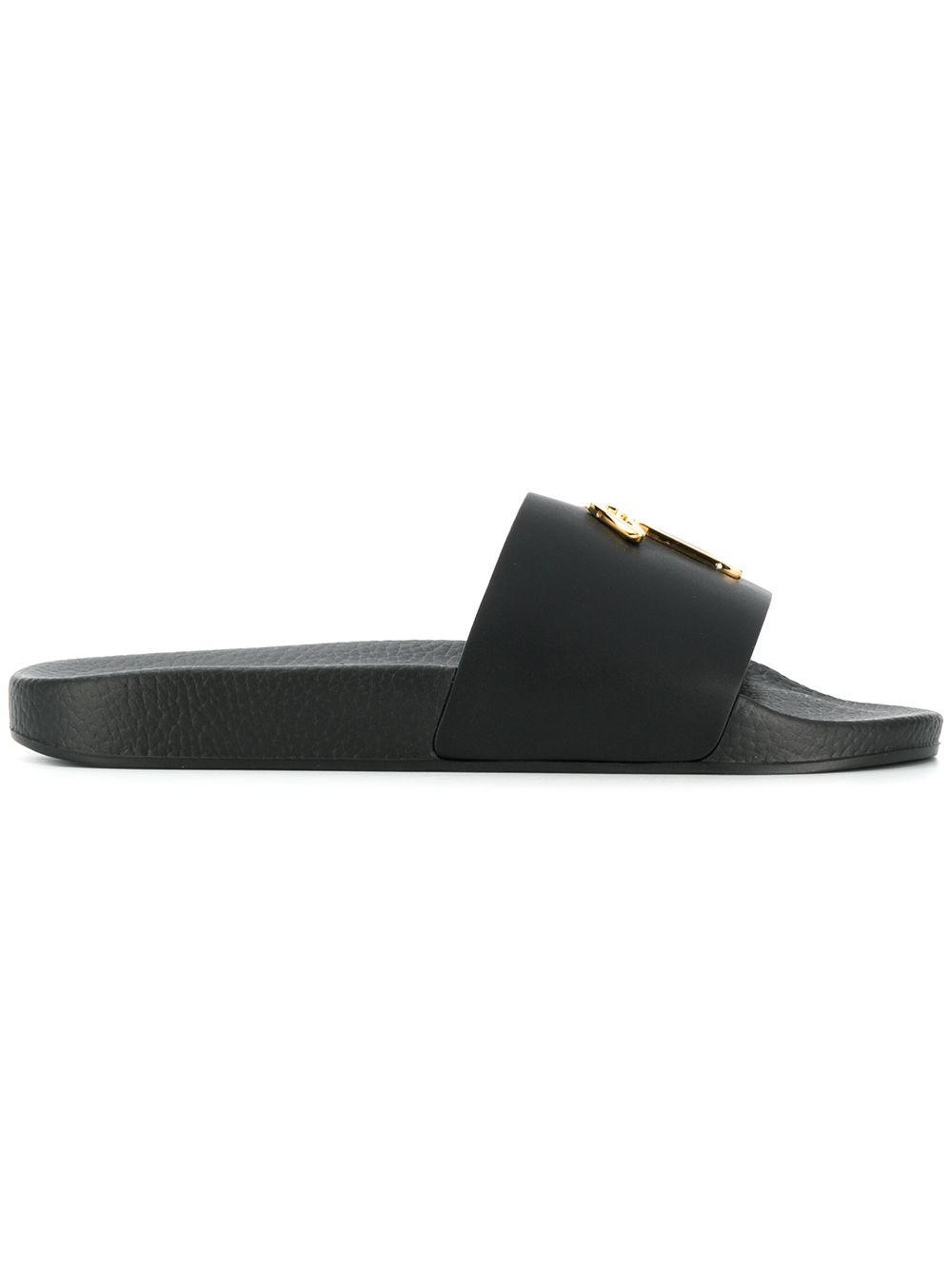 logo plaque sliders Giuseppe Zanotti creates boundary pushing footwear for connoisseurs of flawless construction and opulent detailing. Constructed in San Mauro Pascoli and underpinned by exquisite Italian cordwaining, a Giuseppe last is guaranteed to break rules in the best possible way. These black logo plaque sliders are crafted from leather and features a round toe, a slip-on style, gold-tone hardware and a branded insole. Made in Italy Composition Sole: Rubber 100% Lining: Leather 100% Outer: Leather 100% SIZE & FIT Measurement Sole height 0.39 in(1 cm) HEEL 0.78 in(2 cm)