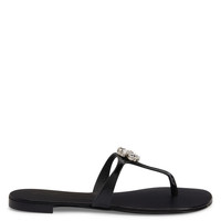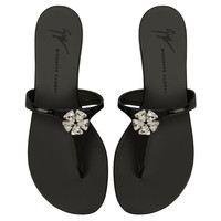 Product Details Flat thong sandals crafted from black patent leather with matching leather soles, embellished with a silver metal accessory with crystal rhinestones. Black patent leather Silver metal hardware with crystal rhinestones 10 mm heel Black leather sole with logo Made in Italy