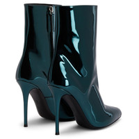 Product Details These pointed-toe ankle boots are crafted from green mirrored-effect synthetic fabric, feature matching covered stiletto heels, a black zipper on the inner side and a black leather sole. Mirrored-effect green synthetic fabric Black and silver metal zipper on the inner side 105 mm heel Heel covered in mirrored-effect green synthetic fabric Black leather sole with logo Made in Italy