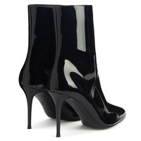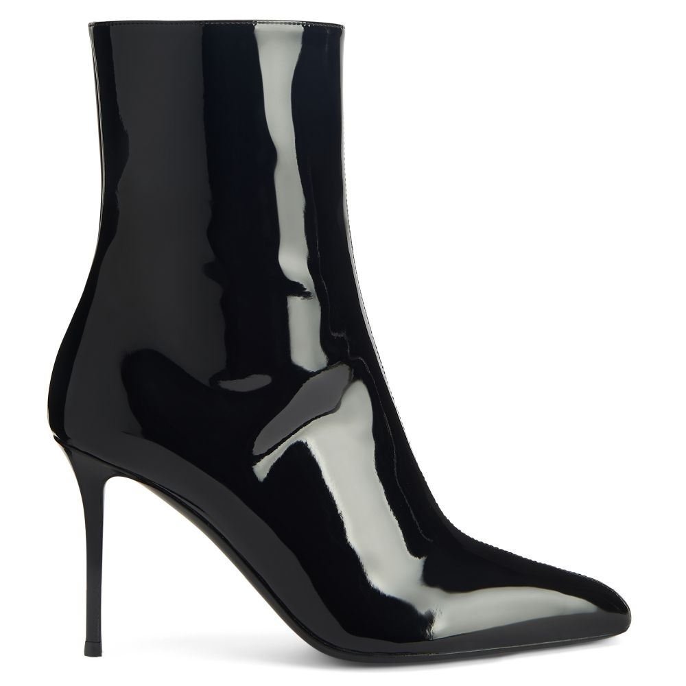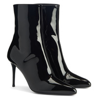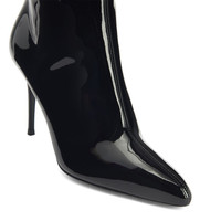 Product Details Pointed-toe ankle boots in black patent-effect synthetic fabric, with matching covered stiletto heel, black metal zip fastening on the inner side and black leather sole. Black patent-effect synthetic fabric Silver metal and black zip on the inside 90mm heel Heel covered in black patent-effect synthetic fabric Black leather sole with logo Made in Italy