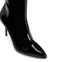 Product Details These pointed-toe boots are crafted from patent-effect black synthetic fabric and feature matching covered stiletto heels, a black zipper on the inner side and a black leather sole. Patent-effect black synthetic fabric Black and silver metal zipper on the inner side 90 mm heel Heel covered in patent-effect black synthetic fabric Black leather sole with logo Made in Italy