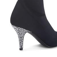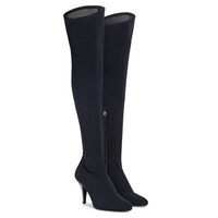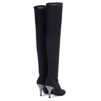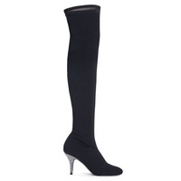 Product Details These thigh-high, pointed-toe boots crafted from synthetic stretch mesh and black leather feature a black and silver metal inner zipper fastening, and are embellished with stiletto heels covered in black suede and with a crystal-coloured rhinestone embroidery. Black synthetic stretch mesh and black leather Black and silver metal internal zipper 85 mm heel Heel covered in black suede with crystal-coloured rhinestone embroidery Leather sole with logo Made in Italy