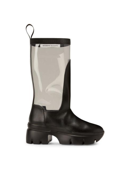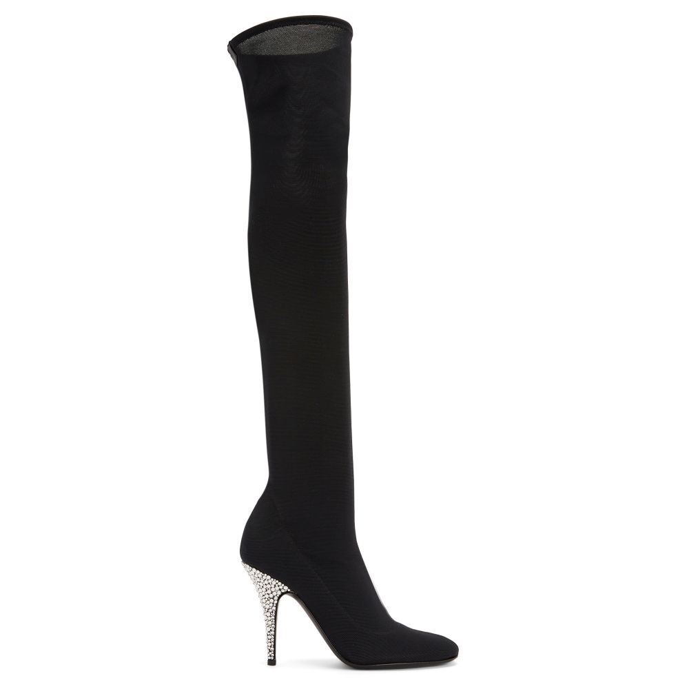 Product Details These thigh-high, pointed-toe boots crafted from synthetic stretch mesh and black leather feature a black and silver metal inner zipper fastening, and are embellished with stiletto heels covered in black suede and with a crystal-coloured rhinestone embroidery. Black synthetic stretch mesh and black leather Black and silver metal inner zipper 105 mm heel Heel covered in black suede with crystal-coloured rhinestone embroidery Leather sole with logo Made in Italy