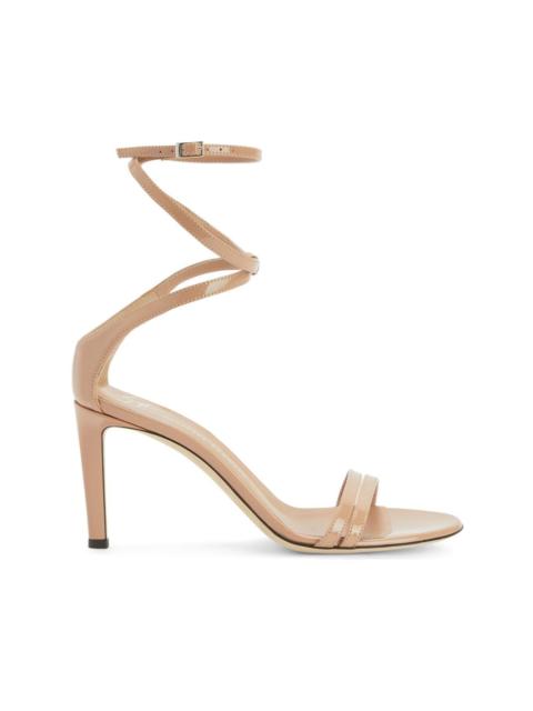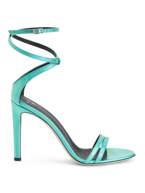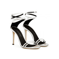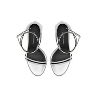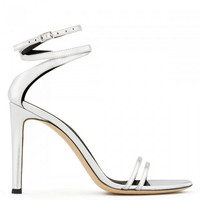 Product Details Sandals in mirrored silver leather with matching covered stiletto heel. Thin strips at the toe and a criss-crossing ankle strap with small side buckle. Leather sole. 105 mm heel Mirrored silver leather Adjustable strap with buckle Leather sole with logo Made in Italy