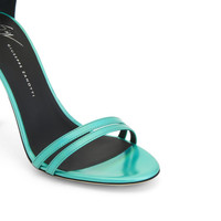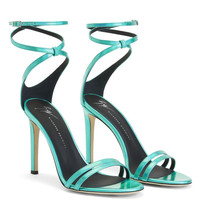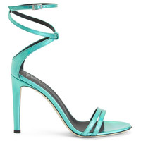 Product Details These sandals are crafted from light-blue laminated leather and feature a leather sole, and are characterised by a matching covered heel, a double front strap and a thin, crossed ankle strap with a small metal buckle to adjust the fastening. Light-blue laminated leather Adjustable strap with buckle 105 mm heel Leather sole with logo Made in Italy
