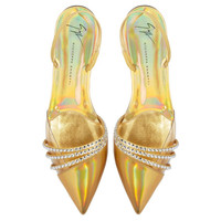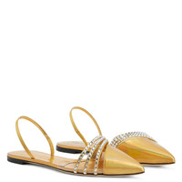 Product Details These pointed-toe slingback flat sandals, crafted from golden laminated synthetic fabric and synthetic satin, feature a toe box with a clear PVC insert and a thin strap on the instep and are embellished with embroidered rows of crystal-coloured rhinestones. Golden laminated synthetic fabric (75% PU; 25% PL)and synthetic satin and clear PVC Crystal rhinestones embroidery 05 mm heel Leather sole with logo Made in Italy