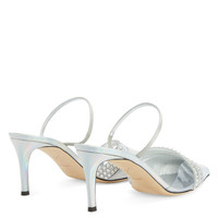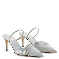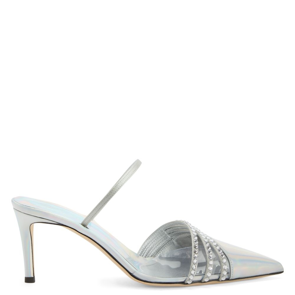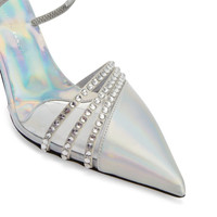 Product Details These pointed-toe mules, crafted from silver laminated synthetic fabric and synthetic satin, feature a toe box with a clear PVC insert and a thin strap on the instep and are embellished with embroidered rows of crystal-coloured rhinestones and a matching covered heel. Silver laminated synthetic fabric (75% PU; 25% PL), clear PVC and silver synthetic satin Crystal rhinestones embroidery Heel covered in silver laminated synthetic fabric (75% PU; 25% PL) 70 mm heel Leather sole with logo Made in Italy