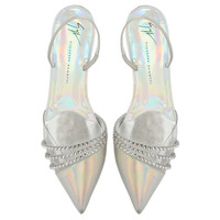 Product Details These pointed-toe slingback flat sandals, crafted from silver laminated synthetic fabric and synthetic satin, feature a toe box with a clear PVC insert and a thin strap on the instep and are embellished with embroidered rows of crystal-coloured rhinestones. Silver laminated synthetic fabric (75% PU; 25% PL), clear PVC and silver synthetic satin Crystal rhinestones embroidery 05 mm heel Leather sole with logo Made in Italy
