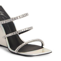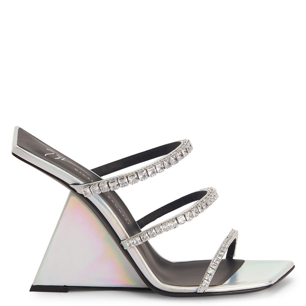 Product Details These mules, crafted from silver synthetic fabric with iridescent mirror effect, feature straps embellished with silver metal hardware and crystal-coloured rhinestones. Complete with leather soles, the design is characterised by its squared edges and peculiar silhouette, boasting an alluring and futuristic style. Silver synthetic fabric with iridescent mirror effect (75% PU; 25% PL) Silver metal hardware with crystal-coloured rhinestones 105 mm wedge Silver synthetic fabric with iridescent mirror effect covered wedge (75% PU; 25% PL) Black leather sole with logo Made in Italy