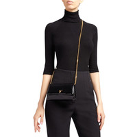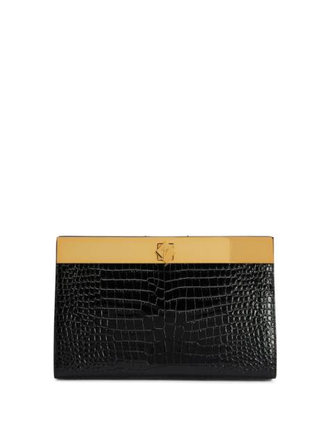 Product Details Clutch bag crafted from black patent-effect synthetic fabric, featuring the iconic golden metal 'Signature' hardware and chain shoulder strap, a magnetic closure on the front and leather and fabric inner lining with card slot and zipper pocket. - Patent-effect black synthetic fabric - Golden metal logo and hardware - Golden metal chain shoulder strap - Magnetic fastening - Leather and fabric inner lining with card slots and zipper pocket - Measurements: 180 mm x 110 mm x 60 mm - Made in Italy ORIGIN: ITALY COLOR: BLACK