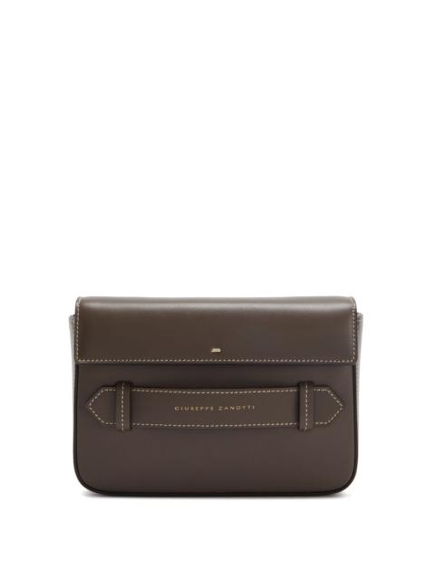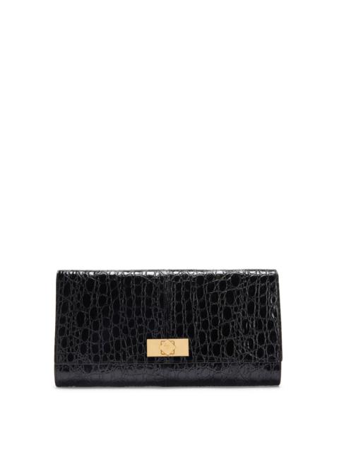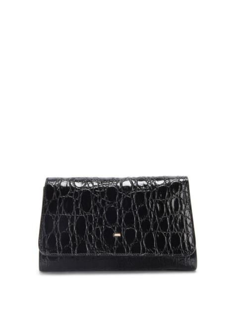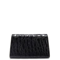 Product Details Crocodile-print leather clutch bag with metal detail, chain shoulder strap, pocket and inner card slots. - Black crocodile-print leather - Golden metal accessory on the outside - Golden metal chain shoulder strap - Magnetic fastening - Leather and fabric inner lining with card slots and pocket - Size: 180 mm x 110 mm x 50 mm ORIGIN: ITALY COLOR: BLACK