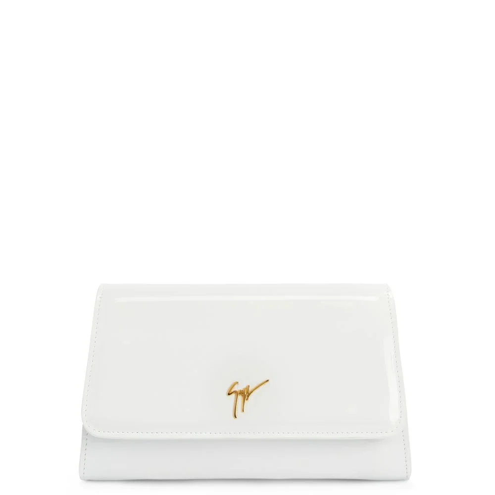 Product Details Clutch bag crafted from white patent-effect synthetic fabric, featuring the iconic golden metal 'Signature' hardware and chain shoulder strap, a magnetic closure on the front and leather and fabric inner lining with card slot and zipper pocket. - Patent-effect white synthetic fabric - Golden metal logo and hardware - Golden metal chain shoulder strap - Magnetic fastening - Leather and fabric inner lining with card slots and zipper pocket - Measurements: 180 mm x 110 mm x 60 mm - Made in Italy ORIGIN: ITALY COLOR: WHITE