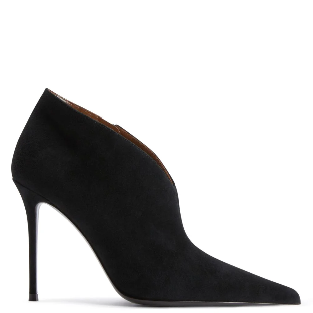 Product Details Ankle boots in suede leather with tapered toe, inner zipper to help put them on and stiletto heel. - Black suede leather - Black zipper on the inside - Heel height: 105 mm. - Brown leather sole with logo ORIGIN: ITALY COLOR: BLACK