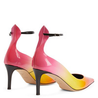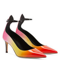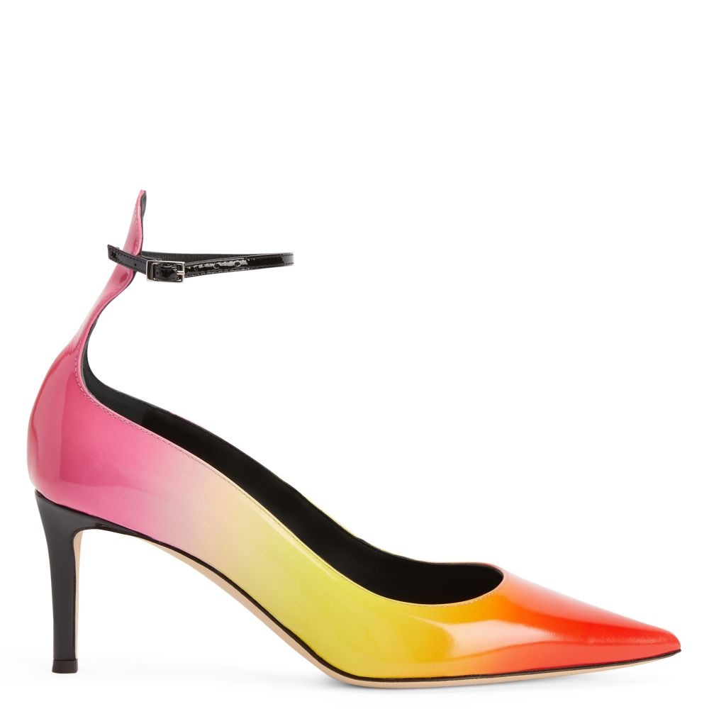 Product Details These pointed-toe pumps, crafted from red-and-yellow gradient patent leather with matching covered stiletto heels and leather sole, feature a tongue that outlines the back of the ankle, attached to a strap that provides an adjustable closure with a silver metal buckle. Red and yellow gradient patent leather Adjustable black patent leather strap with silver metal buckle 70 mm heel Heel covered in black patent leather Leather sole with logo Made in Italy