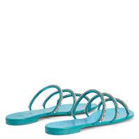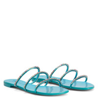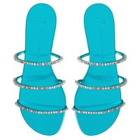 Product Details These flat sandals, crafted from mirror-effect light-blue synthetic fabric, feature thin straps embellished with silver metal chains with multicoloured rhinestones and laminated leather soles with logo. Mirror-effect light-blue synthetic fabric Silver metal chain with multicoloured rhinestones 10 mm heel Light-blue laminated leather sole with logo Made in Italy