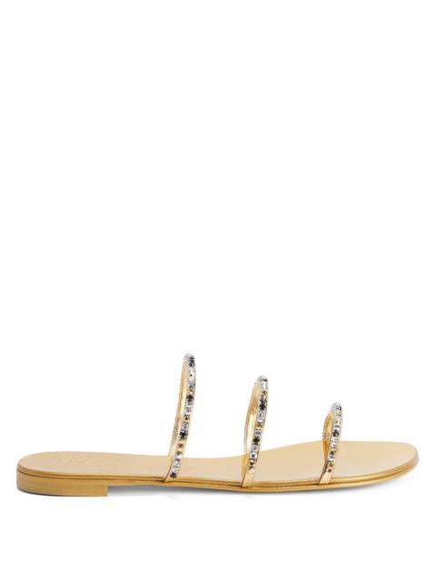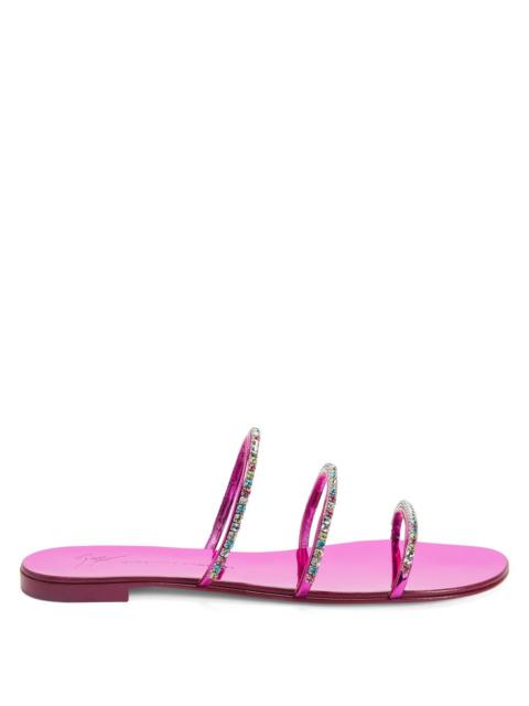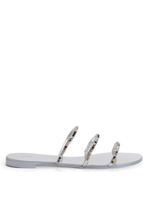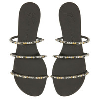 Product Details Flat sandals crafted from patent-effect black synthetic fabric, featuring thin straps embellished by silver metal chains with multicoloured rhinestones and complete with a leather sole with logo. Patent-effect black synthetic fabric Silver metal chain with multicoloured rhinestones 10 mm heel Glossy black leather sole with logo Made in Italy