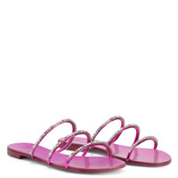 Product Details These flat sandals, crafted from mirror-effect fuchsia synthetic fabric, feature thin straps embellished with silver metal chains with multicoloured rhinestones and laminated leather soles with logo. Mirror-effect fuchsia synthetic fabric Silver metal chain with multicoloured rhinestones 10 mm heel Fuchsia laminated leather sole with logo Made in Italy