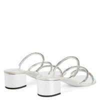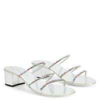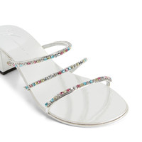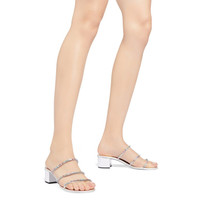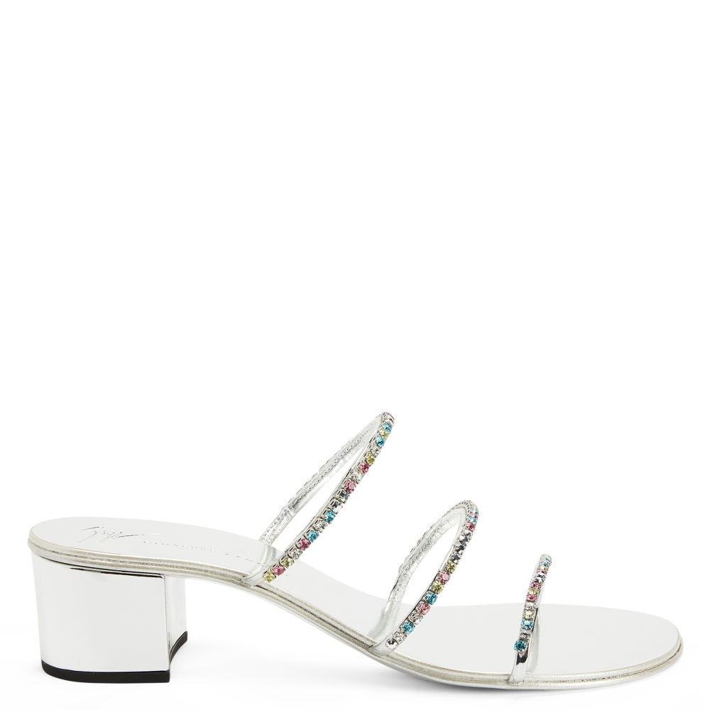 Product Details These mules, crafted from mirror-effect silver synthetic fabric, feature thin straps embellished with silver metal chains with multicoloured rhinestones, matching covered chunky heels and laminated leather soles with logo. Mirror-effect silver synthetic fabric Silver metal chain with multicoloured rhinestones 40 mm heel covered in silver mirror-effect synthetic fabric Silver leather sole with logo Made in Italy