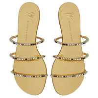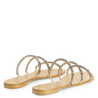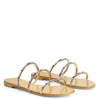 Product Details Flat sandals crafted from mirrored-effect golden synthetic fabric, featuring thin straps embellished by silver metal chains with multicoloured rhinestones and complete with a leather sole with logo. Mirrored-effect golden synthetic fabric Silver metal chain with multicoloured rhinestones 10 mm heel Laminated golden leather sole with logo Made in Italy