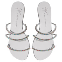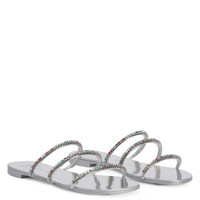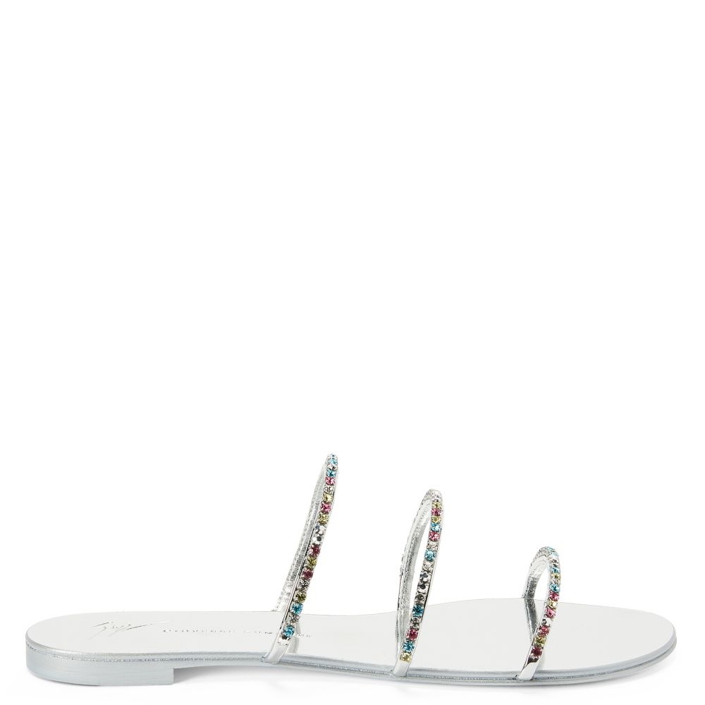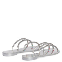 Product Details These flat sandals, crafted from mirror-effect silver synthetic fabric, feature thin straps embellished with silver metal chains with multicoloured rhinestones and laminated leather soles with logo. Mirror-effect silver synthetic fabric Silver metal chain with multicoloured rhinestones 10 mm heel Laminated silver leather sole with logo Made in Italy