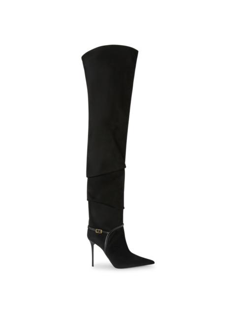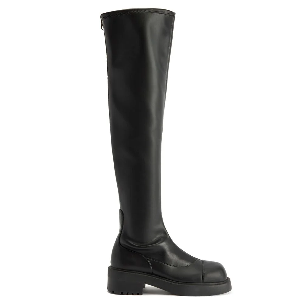 Product Details Knee-length boots in stretch fabric and leather with one-piece rubber sole. - Upper: Fabric containing 44% polyurethane, 56% polyester - Insole: goatskin - Sole: Rubber ORIGIN: ITALY COLOR: BLACK