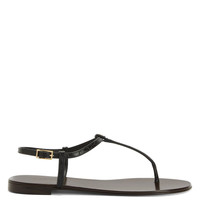 Product Details Flat thong sandals in crocodile-print leather with metal detail and adjustable strap with metallic buckle. - Black crocodile-print leather - light golden metal accessory and light golden metal buckle - Heel height: 10 mm. - Shiny brown leather sole with logo ORIGIN: ITALY COLOR: BLACK