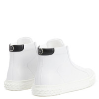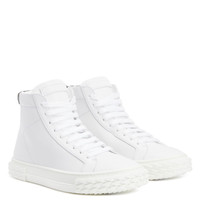 Product Details High-top trainers in synthetic white fabric, with logo-bearing black detail on the heel. The white Signature on the tongue and eye-catching, white 3D-effect rubber ''Blabber'' sole give this shoe''s design the perfect finish. ' Black and white synthetic fabric: 24% Recycled Polyester 76% Polyurethane Signature label ‘Blabber’ rubber sole with logo Made in Italy